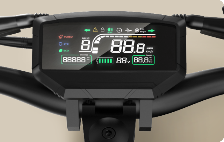 [1] Max Range: Tested with a full battery, 150 ± 11 lbs load, and 70 ± 5 °F ambient temperature, riding at a constant maximum speed of 16 mph on pavement. Actual range may vary depending on speed, frequency of starts and stops, ambient temperature, and other factors.