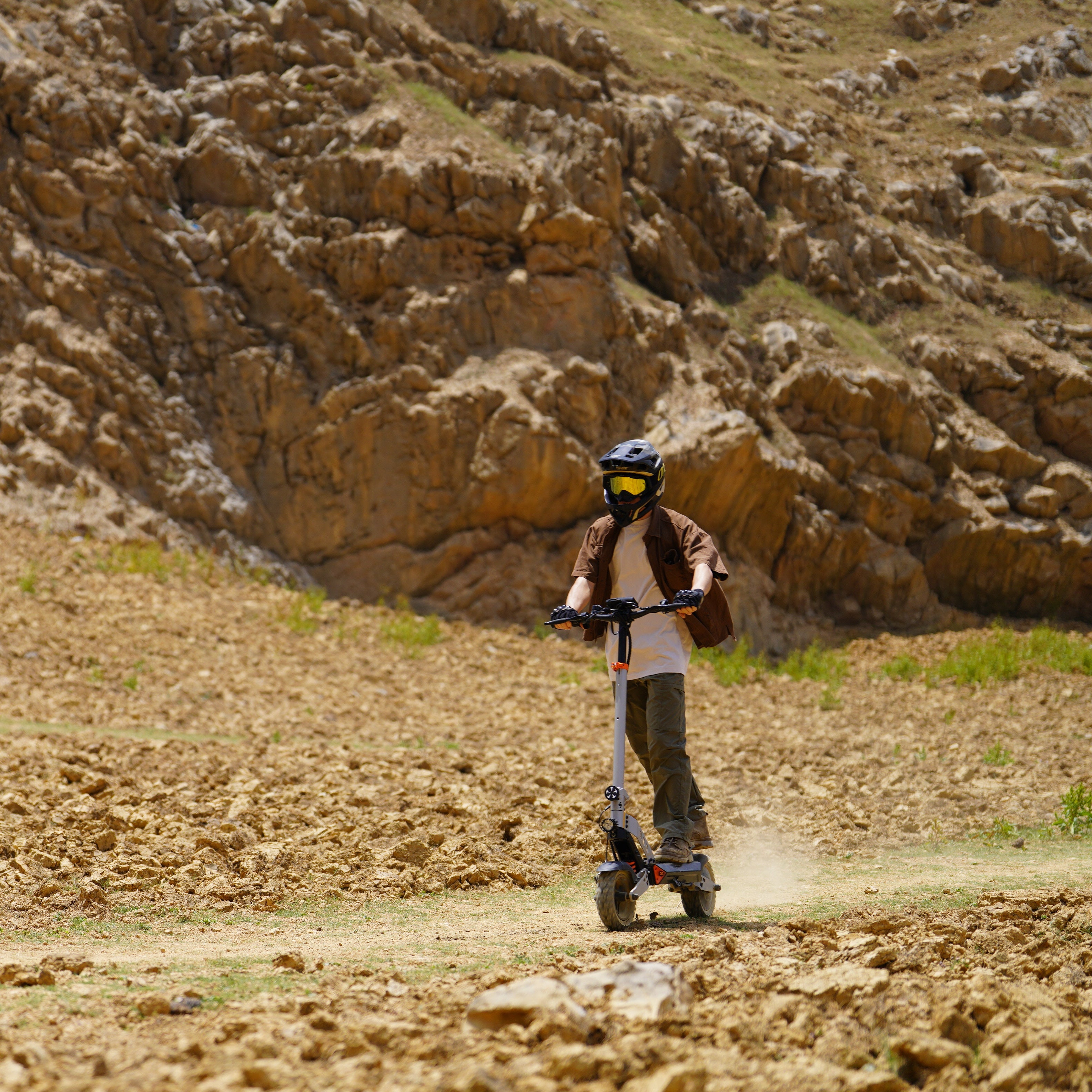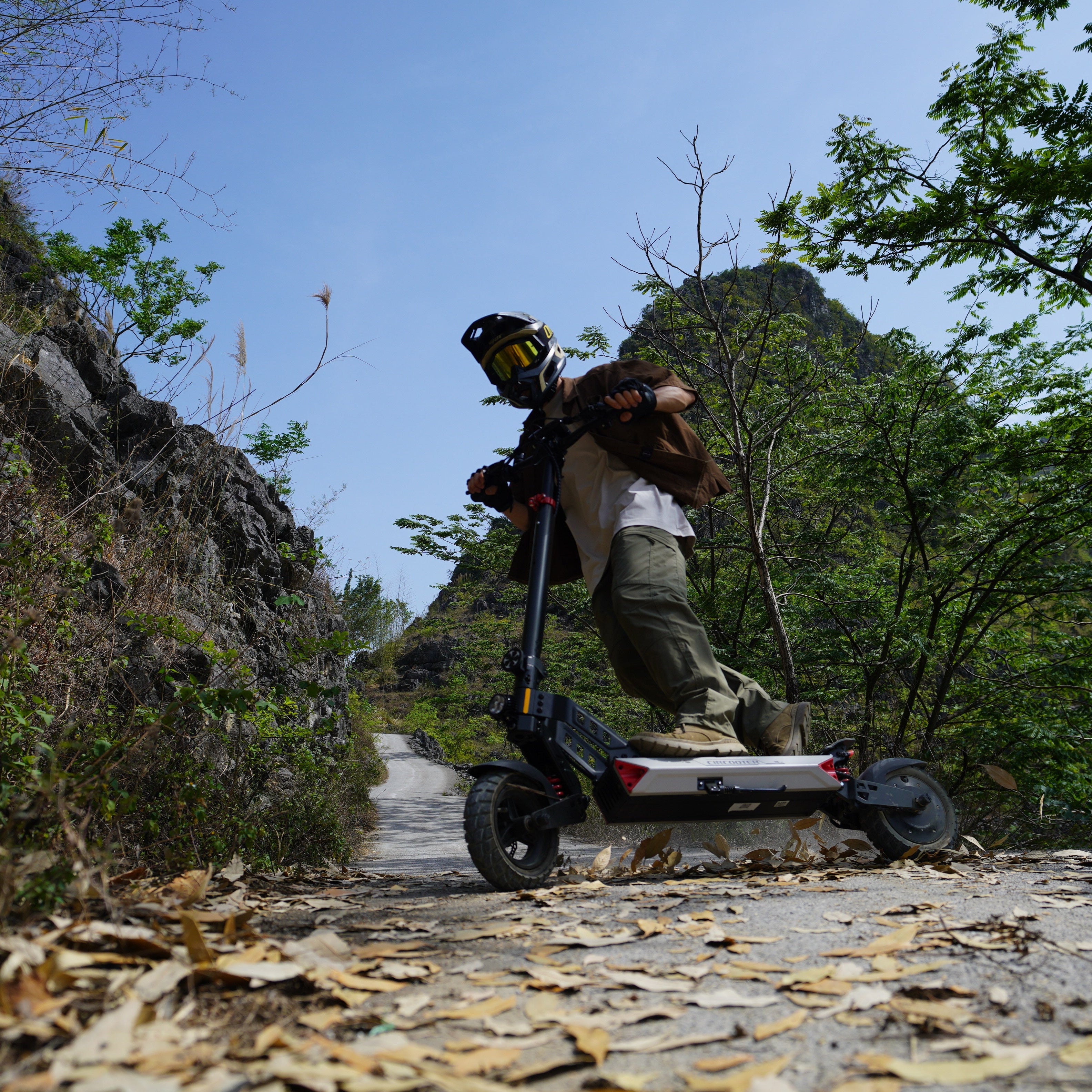 Equipped with 10" air-filled all-terrain tires, this scooter glides smoothly over city streets, grips slick rainy roads, and powers through rugged off-road trails. It effortlessly conquers steep hills up to 30% grade.