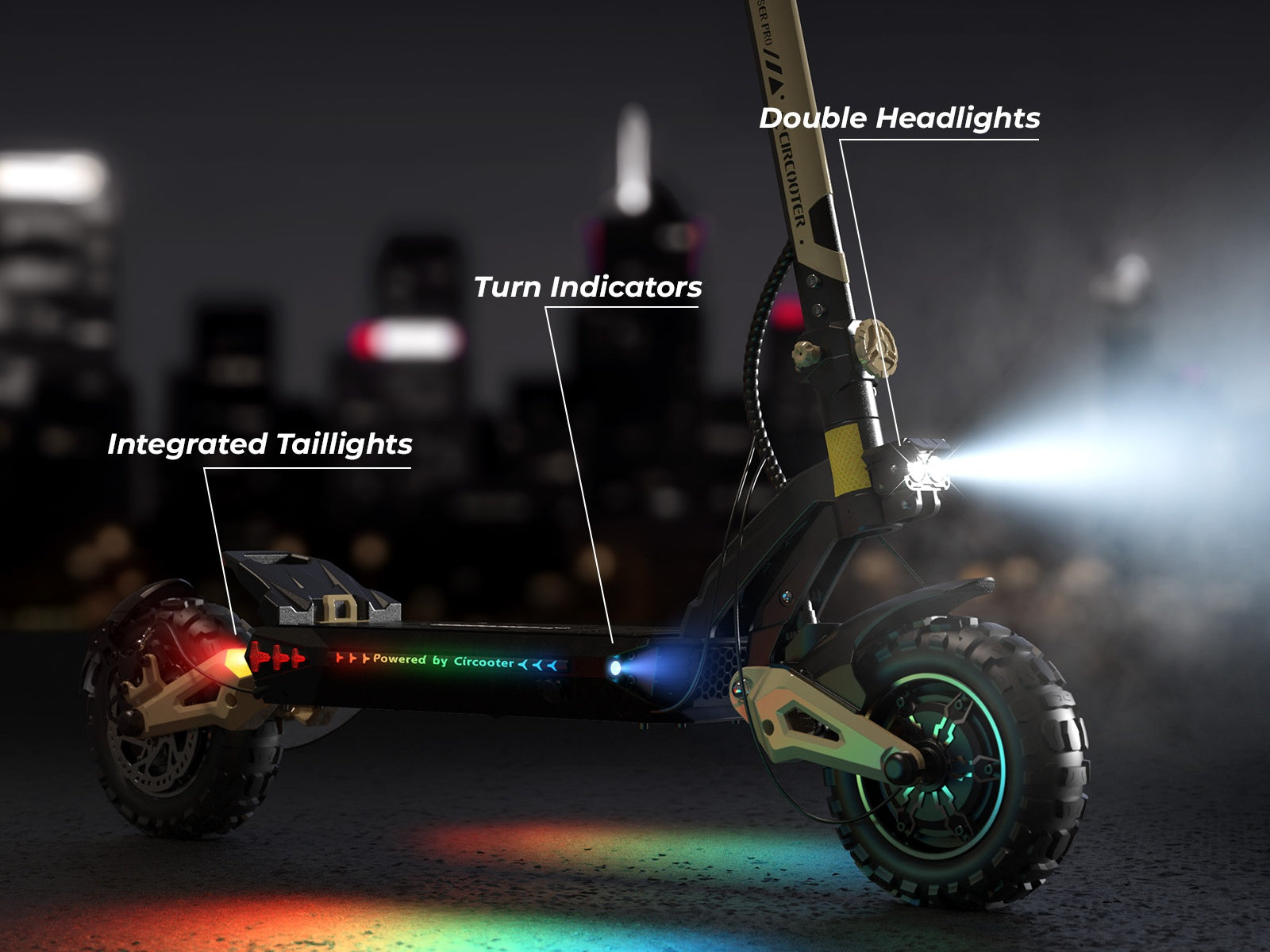 Circooter puts rider safety above everything. A high-visibility headlight lights your path at night, and the turn-signal tail light warns others of your upcoming turns, ensuring safer, more predictable riding in low-light conditions.