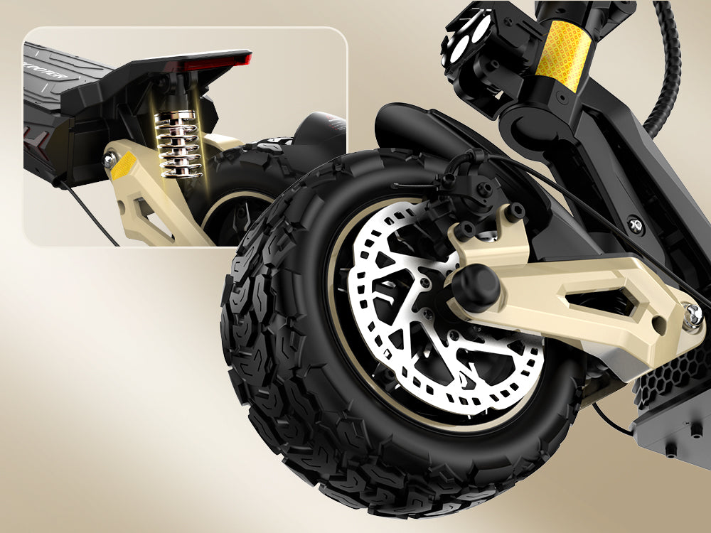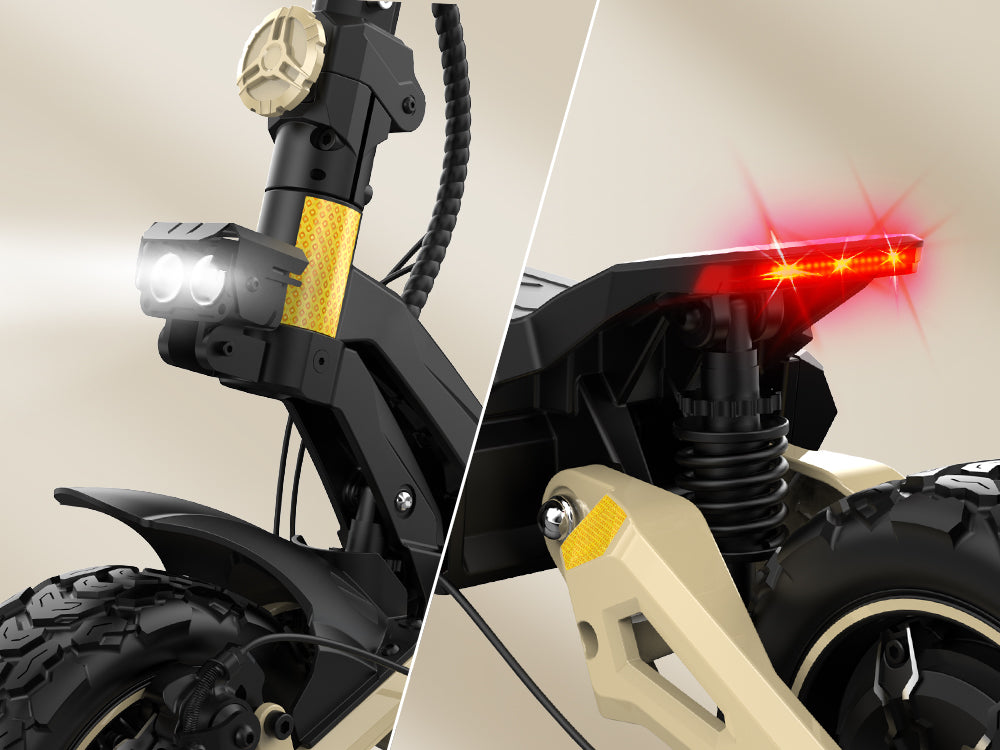 Dual braking delivers strong, responsive stopping power, while rugged 11-inch off-road tires with deep tread ensure superior grip, stability, and comfort on both city streets and challenging trails.