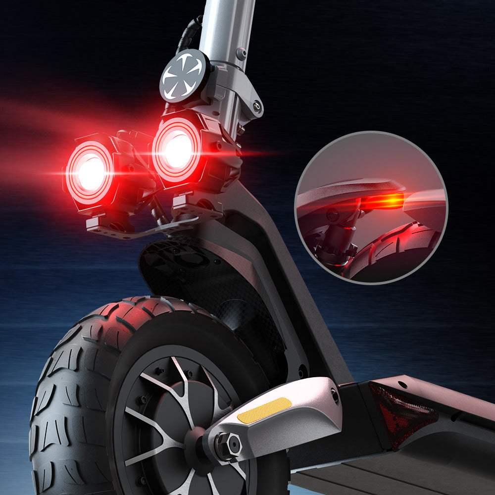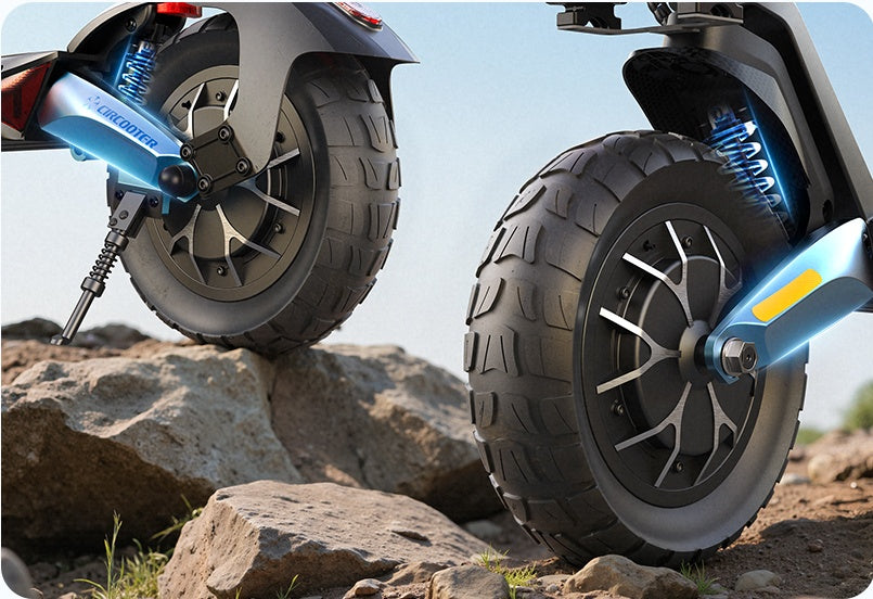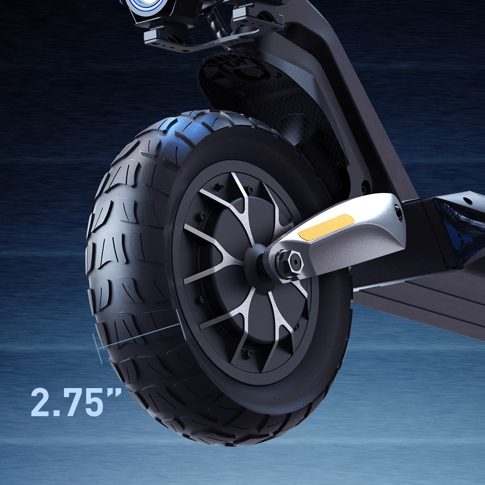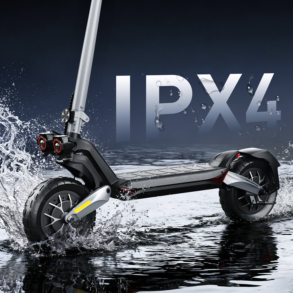 This electric scooter features an 8-inch ground clearance, allowing it to pass quickly through shallow puddles. It is rated IPX4 for splash resistance, but we still recommend avoiding heavy rain and deeper water.